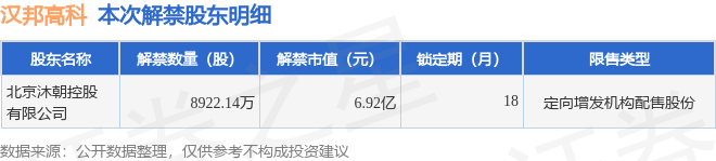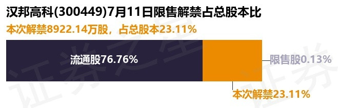 证券之星消息,根据市场公开信息整理,汉邦高科(300449)于7月11日将有8922.14万股限售股份解禁,为公司定向增发机构配售股份,占公司总股本23.11%。(本次数据根据历史公告整理得出,实际情况以上市公司最新公告为准)本次解禁后,公司还有48.33万股限售股份,占总股本0.13%。具体如下图所示: